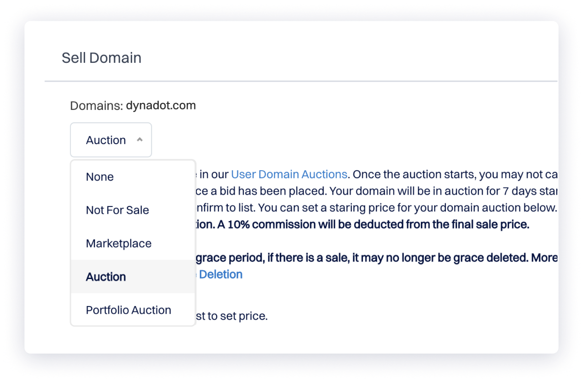 拍卖是避免与潜在买家谈判或自行研究价格并设定的完美方式。您只需将您的域名列在'用户拍卖'下,设置最低出价金额,然后等待出售给出价最高者。列出域名的流程与在市场上出售相同,直到最后一步。